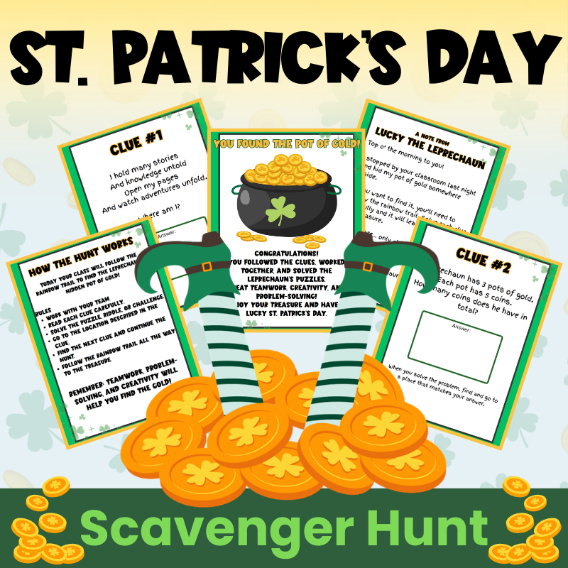 The Search for the Lost Leprechaun Gold Scavenger Hunt sends students on a rainbow trail of clues where they solve problems as a team to track down the missing gold.